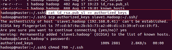 然后在拷贝authorized_keys到slave1.Hadoop上:scp authorized_keys slave1.Hadoop:~/.ssh/